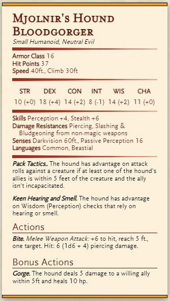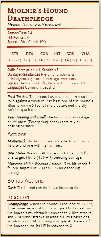 The Deathpledge is your heavy-hitter in a Mjolnir’s Hound encounter. When its health is reduced by half and it suddenly empowers into a flurrying fur ball of violence, your party should freak out and begin panicking about whether there are any more of them in play! For optimum use, you want your Deathpledge to be knocked to half HP by one of the lower AC, melee characters in your group such as a rogue or monk. Even with their tendency to use hit and run tactics, the speedy Deathpledge should be able to close the gap with either its movement or bonus action dash. The worst-case scenario for this guy is to be locked in combat with a high AC tank or trapped by controlling magics when its Deathpledge feature triggers.