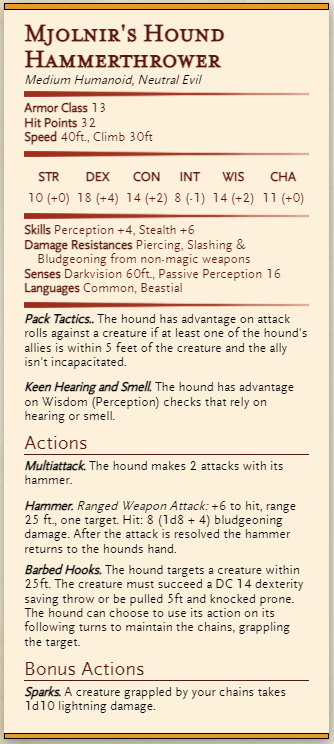 The Hammerthrower is the ranged support of the group. Whether by throwing their returning hammers or by locking down an enemy with their hooked chains, they can be an often-overlooked threat. You’ll want to keep your Hammerthrowers at the edge of the fight, harrying the characters that are already at risk of being overwhelmed in melee combat. When someone tries to run to the rescue, hook them up and pull them off their feet, leaving them vulnerable to those nasty advantage melee attacks from your melee creatures. It can be tempting to use your ranged options to deal with the parties ranged threats that might be hiding in the back but if you look at the Pack Tactics feature, nowhere does it specify melee attacks. That’s right, Pack Tactics applies to ranged attacks.