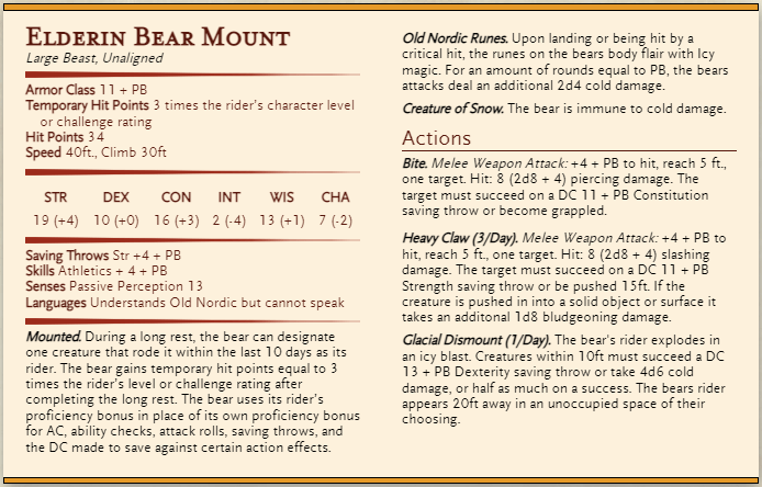 These runes allow the bears to buff themselves with icy powers when in situations of danger or intense fury, as well as being utilised by their riders to allow for dramatic explosive dismounts. The bear is very acclimatised to cold conditions and has developed an immunity to weaponised cold.