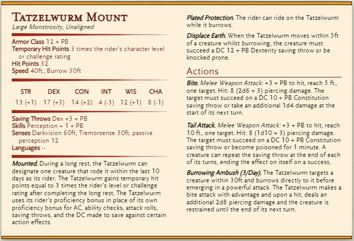 The creature is a proficient burrower and uses this talent to ambush and knock down its prey. When used as a mount, the Tatzelwurm can be a powerful ally, allowing its rider to reposition with ease and make full use of its burrowing speed.