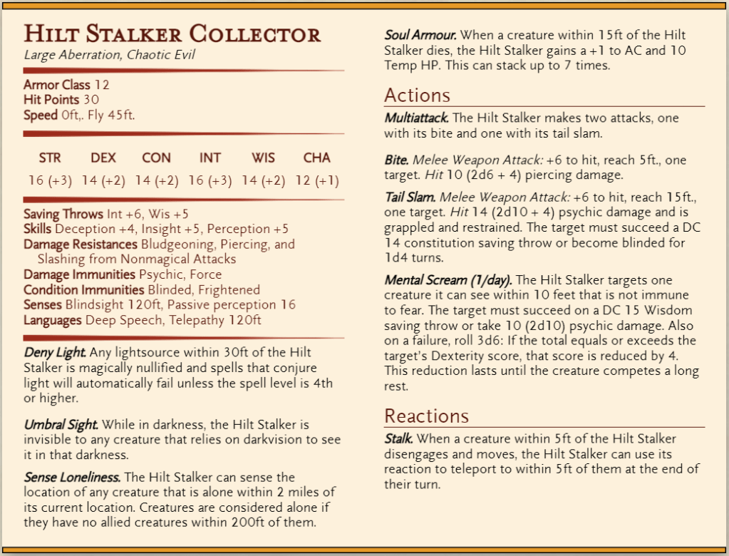 The Hilt Stalker Collector is best utilised in a crowded space with lots of squishy NPCs such as a town or city. They rely on killing weak creatures to buff themselves, so if facing off against just the party, it’s unlikely they’ll ever be more than an easy kill. When the battle starts, the Collector should dive towards the nearest common villager or hapless pet and immediately begin tearing through them, receiving as much of its Soul Armour as possible before the party turns their attention to it. Once it feels adequately buffed, it should fly directly into the largest clump of characters that is available and hit them with its once-a-day Mental Scream. From there, pick a target and stay with them. If they disengage and run, use Stalk to stay right behind them. The Collector is a creature that chooses a target and focuses on them until they are dead. This means it’s a creature that will absolutely finish off a player character if it downs them, all for that tempting Soul Armour buff.