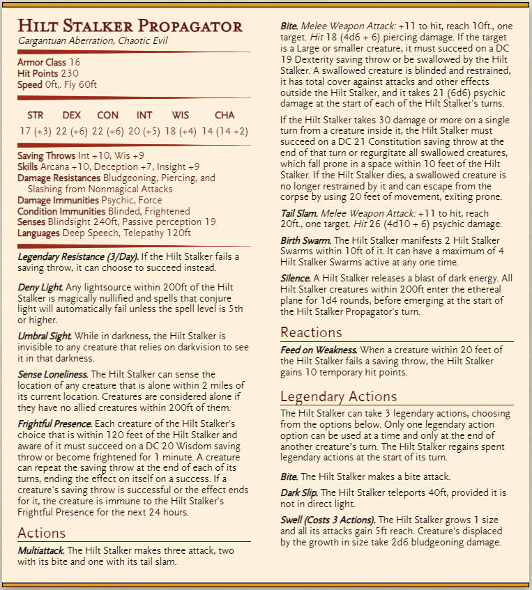 The Hilt Stalker Propagator is a powerful, threatening creature that comes with all the strength of a legendary creature. It has ways to sustain itself, deal heavy damage, has incredible reach, causes fear just to be around it, and can even temporarily blink all of its kind out of existence to allow its children to set up ambushes mid-fight. It’s truly an intimidating threat. There is little reason to delay combat for the Propagator. Unless it is taken entirely off-guard it should already have Hilt Stalker Swarms summoned and be prepared to charge into melee combat with the most threatening character it see’s, letting its children deal with the squishier foes. The Propagator is a highly intelligent creature and will use this to its advantage. It will stall the strongest enemies and then suddenly use its incredible reach to finish off a nearby weakened foe that thought it was safe. If the battle seems to be going poorly and the Hilt Stalkers need time to adjust, it will use its Silence action to allow its children time to reposition and prepare for fresh assaults.
