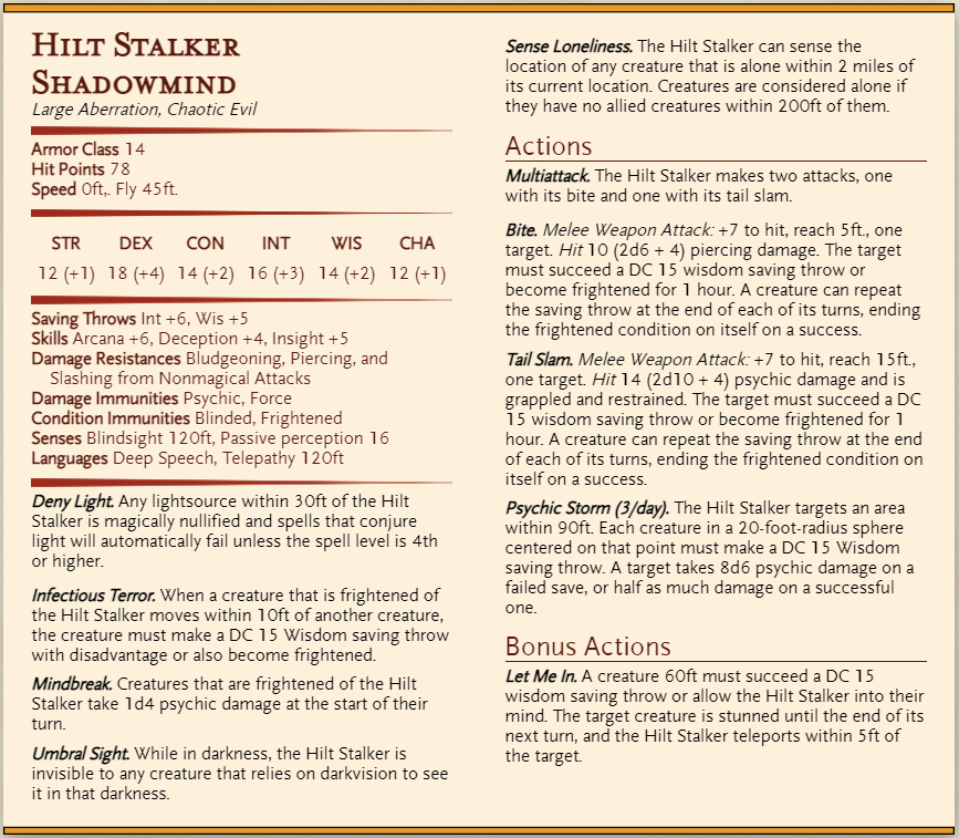 | DC 20 | Hilt Stalkers are nocturnal predators and have an other-worldly connection to the dark. They can snuff out light through their presence alone. |