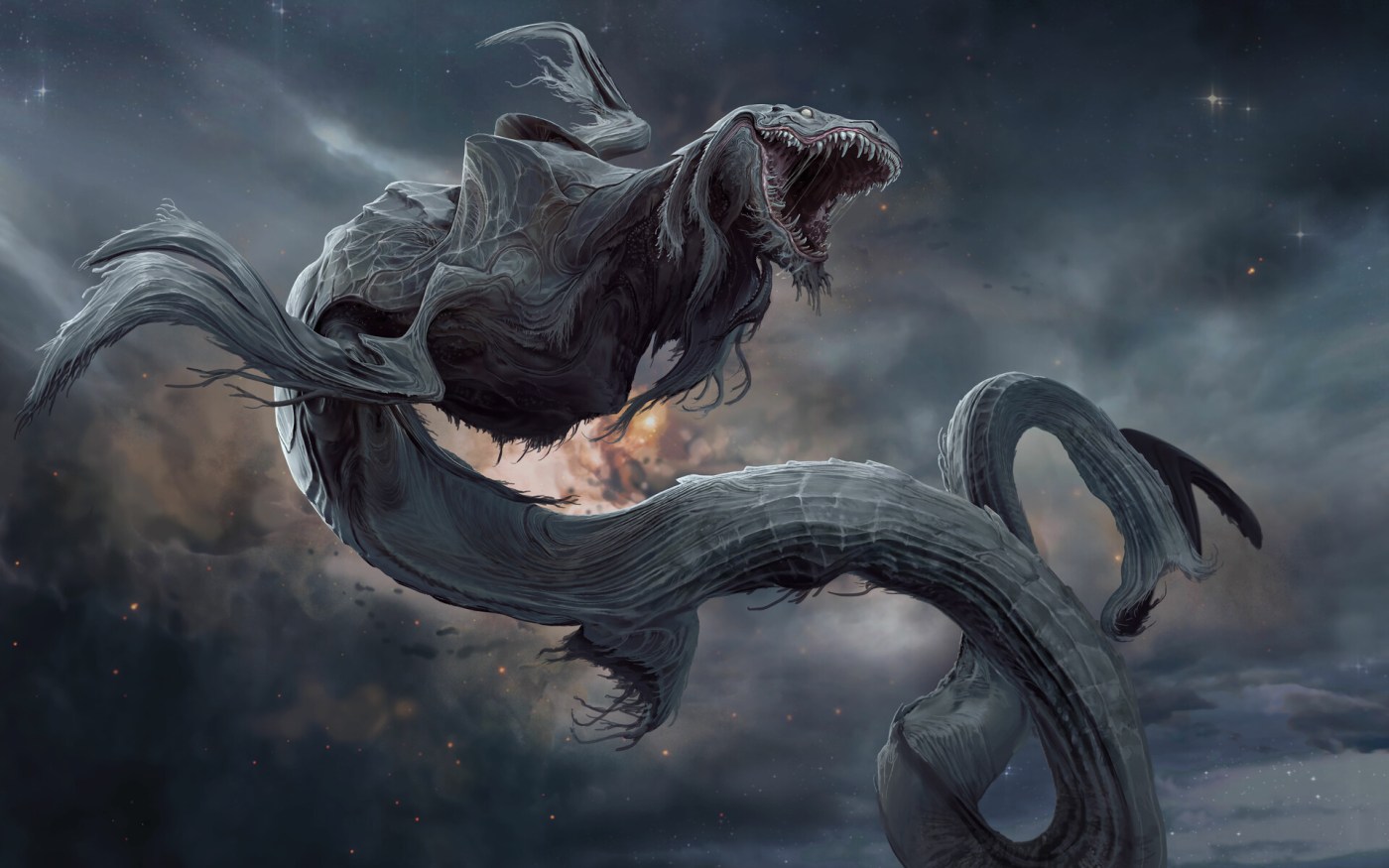 Hilt Stalkers are long, wispy snake-like creatures with loose, shredded, grey fabric-like skin. They can grow anywhere from 13 to 24 feet, with the largest species exceeding hundreds of feet long. Wide, fanged jaws and beady, functionless eyes create a shadowy visage, reminiscent of that of a deep-sea eel.