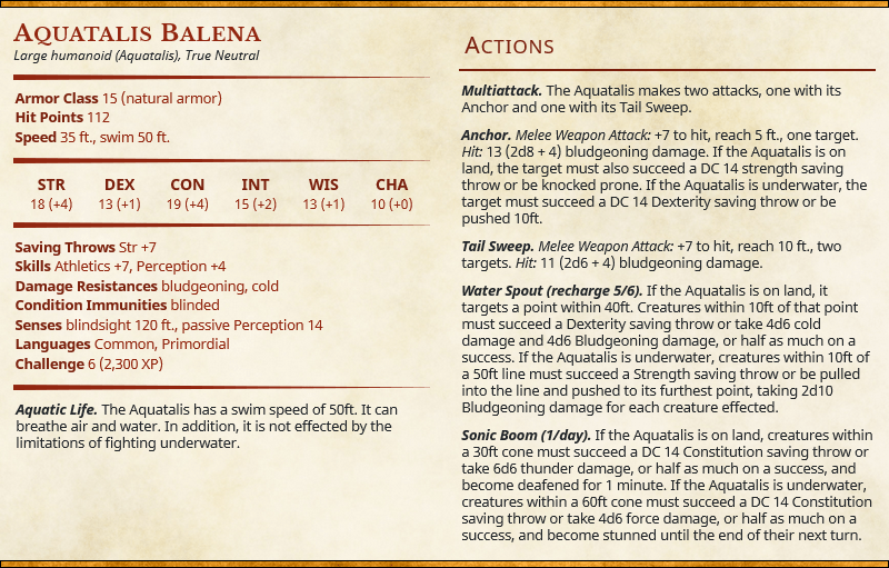 Aquatalis Balena are durable brawlers that have multiple options for kicking off combat with a bang. Both their Water Spout and Sonic Boom actions can send your party into a panic by dealing some significant damage and causing them to split up. Unique to the Aquatalis Balena is the adaptable attacks that vary depending on if the creature is on land or underwater. This can keep your players on their toes if they encounter the creature multiple times in different environments.
