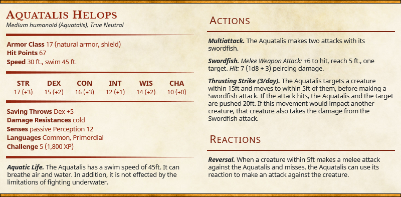 This creature can be a powerful combatant if it is left to position itself in a strategic location. The Thrusting Strike can be used up to 3 times a day and can hit multiple enemies. If unable to find a good position for Thrusting Strike, the multiattack, plus Reversal reaction, can still have the Aquatalis making up to three attacks per turn. When used in a group with other creatures, try to line up a Thrusting Strike while the other creatures engage to prevent the party from moving freely.
