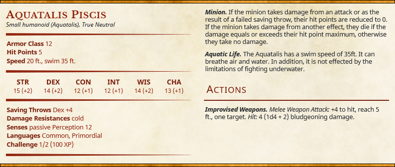 As minion-type enemies, Aquatalis Piscis are expected to die in large numbers. Their primary purpose in an encounter is to bog down the player characters and make travel difficult. They aren’t intelligent creatures, so feel free to simply charge them into the nearest enemy and try and get any hits you can before they’re quickly (and impressively) dispatched. These creatures are an excellent opportunity to make your party feel powerful as they cut through masses of monstrous fish people.