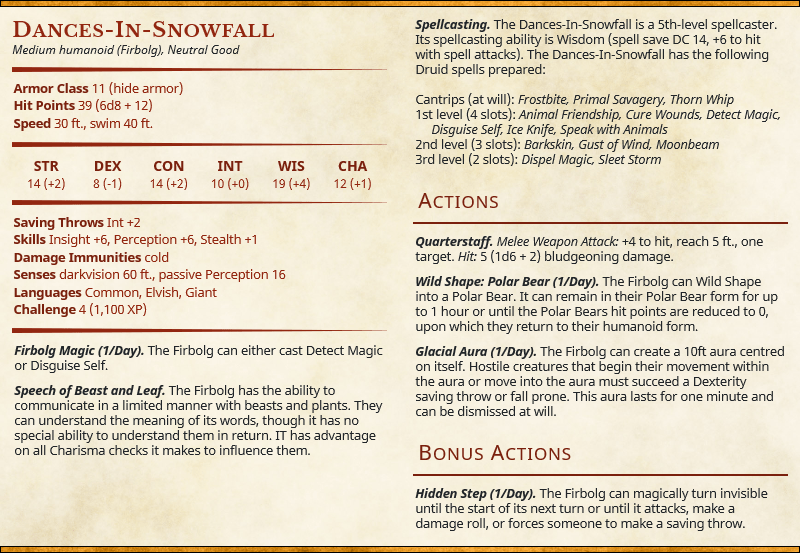 It’s during this time that your party might meet Dances-In-Snowfall, the Firbolg Druid. Dances-In-Snowfall is an excellent opportunity to learn what happened to Galagor, as he was indirectly responsible. Guilt wracks the Firbolg and an inciteful character might pick up on this and be able to ask targeted questions to get the truth. Despite their guilt, Dances-In-Snowfall remains on the side of the Yeti, and if he learns or senses the party’s true intentions for finding them, he’ll become fully against aiding them further. He might also show up during the fight against the Yeti’s to defend them.