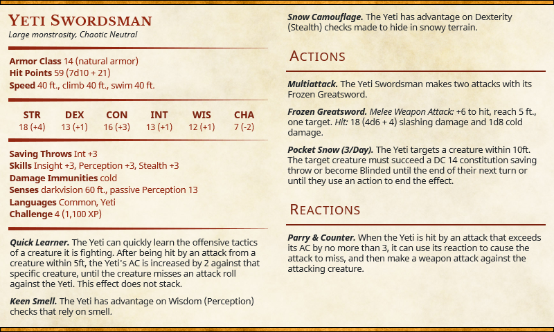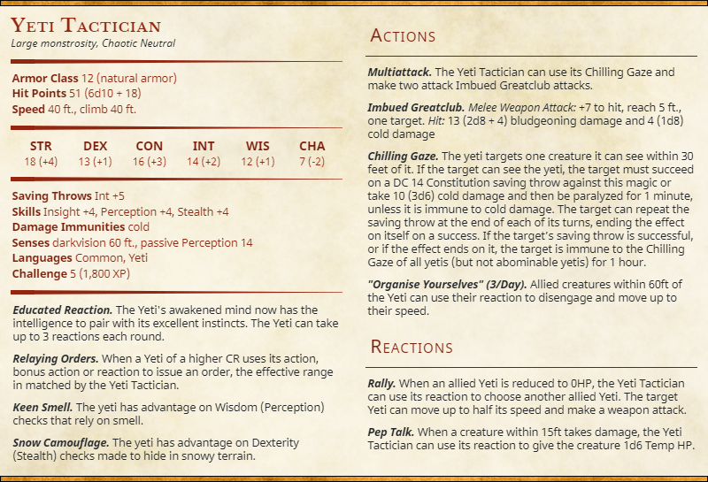 Whether your party perform an ambush or charge in loudly, a fight will break out. This combat encounter uses 3 types of intelligence Yeti stat blocks that I have built for you and can be found below. Each can be clicked to easily download the statblock.