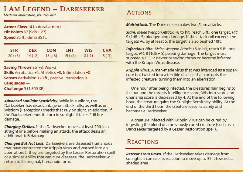 The Krippin Virus is an interesting disease with a challenging cure condition. It doesn’t turn the infected creature too quickly to act but it does rely on the party having access to already cured people to manufacture new cures. Make sure to add a local cleric to the area that can cast Lesser Restoration if needed. Otherwise your party might end up in a scary death spiral!