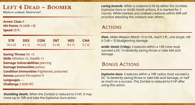 Like all Zombies, the Boomer is a monster that is designed to die (and feel satisfying when it does). Unlike most other options though, it’s at its strongest when it dies! This is a Zombie that will cause panic as soon as your players realise what it is and will probably make them target no.1 to your party! This is by design and you should expect that most of these guys won’t actually make it into combat range. They do have a few tricks up their sleave to give them a fighting chance though! Most notably, the fact they can move up to 10ft after dying before they explode into gore, just incase they needed those last few strides!