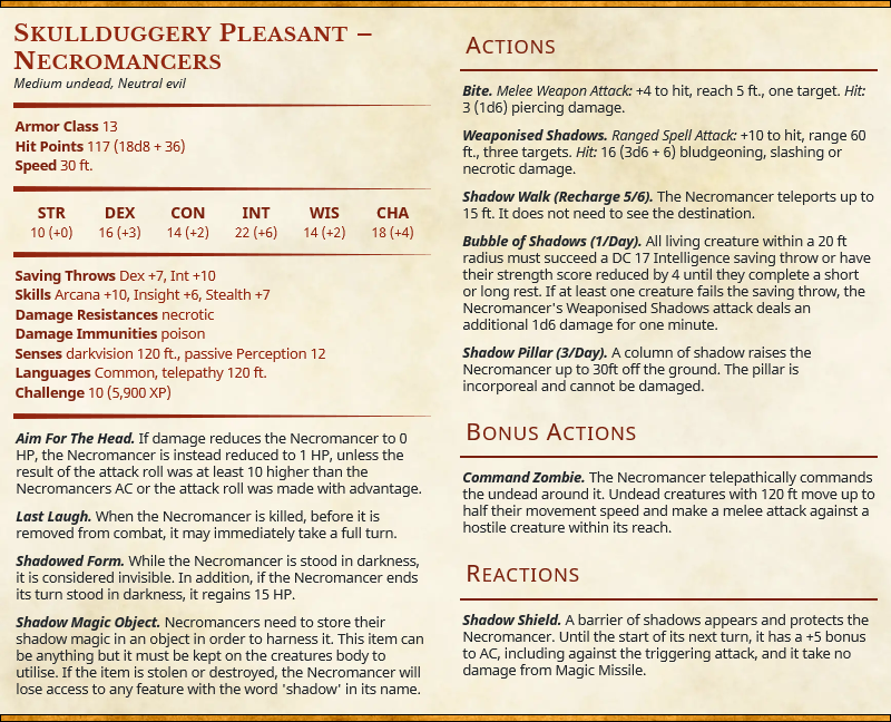 Necromancer is intended as a commander of undead armies and should avoid engaging the party without significant undead reinforcements. They are highly intelligent and should be able to outsmart the party through prediction and analysis of their abilities.