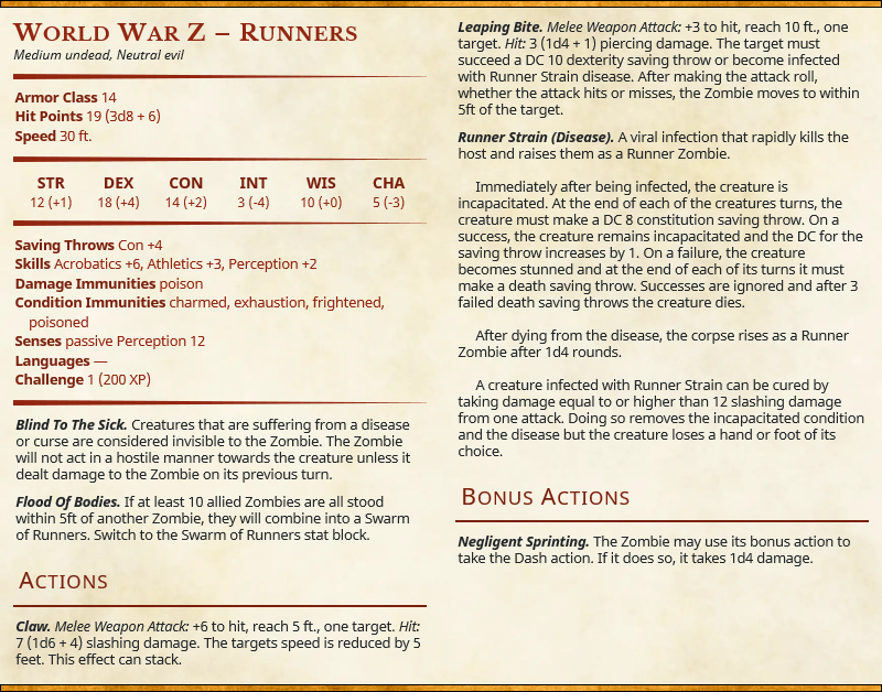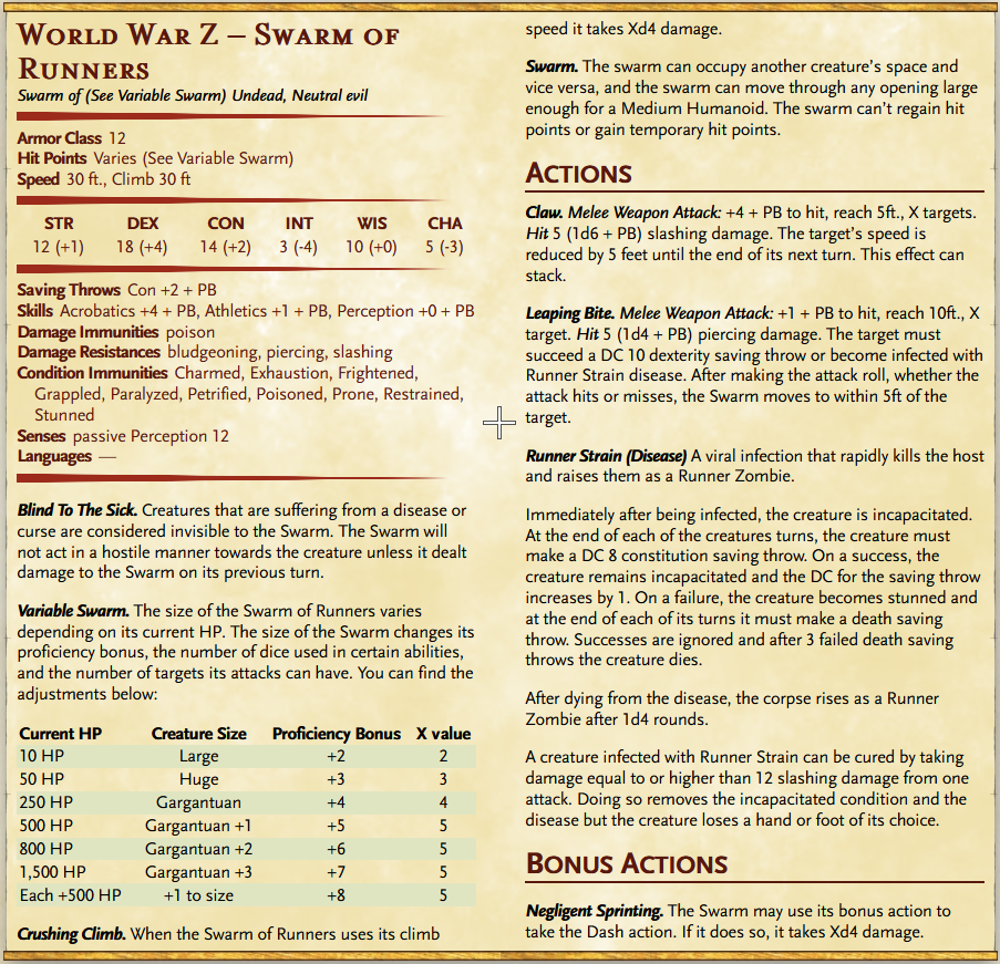 As for the swarm, this stat block needed to be adaptive due to the varying size potential. The stat block assumes that 1 HP is one Runner Zombie and gets increasingly dangerous the more Zombies are smushed into the hoard. Honestly, I don’t think I would use one of these in direct combat with a party unless they were very high level, especially not a big one! The way I invision one of these being used is as an objective. I imagine a party of adventurers stood high upon the cliffs of a ravine, blasting the swarm with spells and arrows as it charges towards a defenseless village further down the valley. Pretty cinematic!