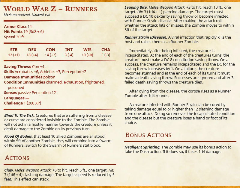 Disclaimer: A couple of these Zombie stat blocks come with built in diseases that further the spread of their specific Zombie virus. You could easily kill characters with these diseases so be sure to readily provide your players with the information on how to cure it! This could be via research, a knowledgable NPC, or a medicine check. At your discression, I’d allow the Lesser Restoration spell to also work, as it can only be used so many times a day and they still might run out of uses depending on how many of these bastards they end up facing!