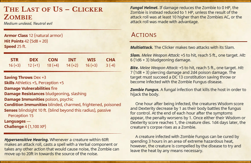 The Clicker, while not exactly smart, is still capable of more thinking than your regular Zombie. Make note of its blindness to allow your players to outsmart it and remember, it doesn’t need a reaction to move towards sound! So, unless it can already see someone with its 10ft blindsight, keep it rushing towards those noisy adventurers!
